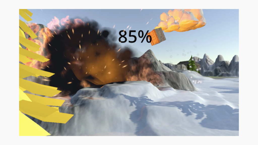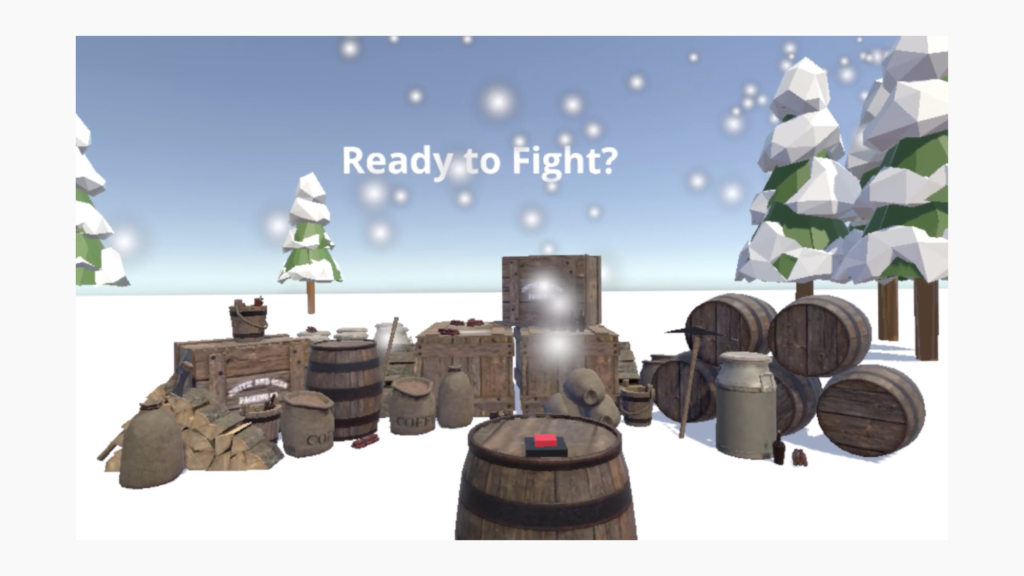Fast-paced 1v1 arena gameplay in real time. The users can experience the snowy world by using both VR controllers and their headset. If a player is hit by an enemy carrot-grenade they will lose life points, however they can move around the map using their teleportation-snowballs. Also, by standing underneath snow clouds players can regenerate life points. While losers are teleported to hell – where they are continuously insulted – the winner is rewarded with a fireworks spectacle.