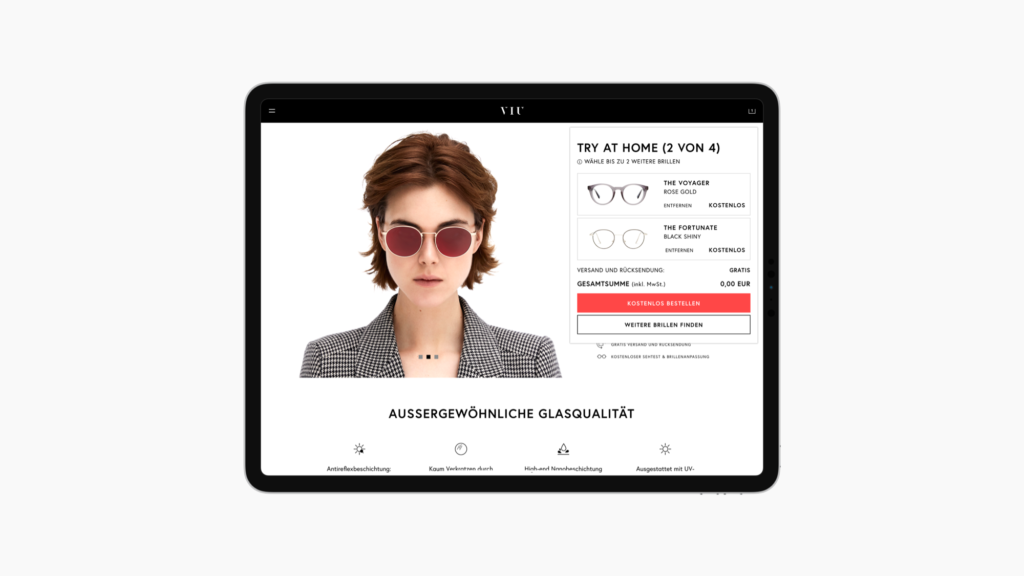 The main objective for the web shop was based on a multi-channel approach with the aim of bringing together VIU’s online and offline businesses. To achieve this, “Try at Home” was introduced. Customers could order glasses for free and try them at home with the goal to drive them into the stores afterwards. Since this concept has proven to be very successful, the online marketing strategy was based on how to use this lever and optimize conversions.